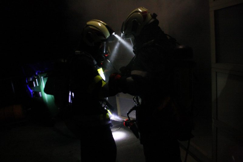 Die Übungsannahme war eine vermisste Person, in der durch einen Brand verrauchte Fahrzeughalle, zu retten. Bei der Anfahrt zum Einsatzort wird wertvolle Zeit gespart, wenn die Atemschutzausrüstung bereits vollständig angelegt wird, daher wurde dies gleich zu Beginn geübt.