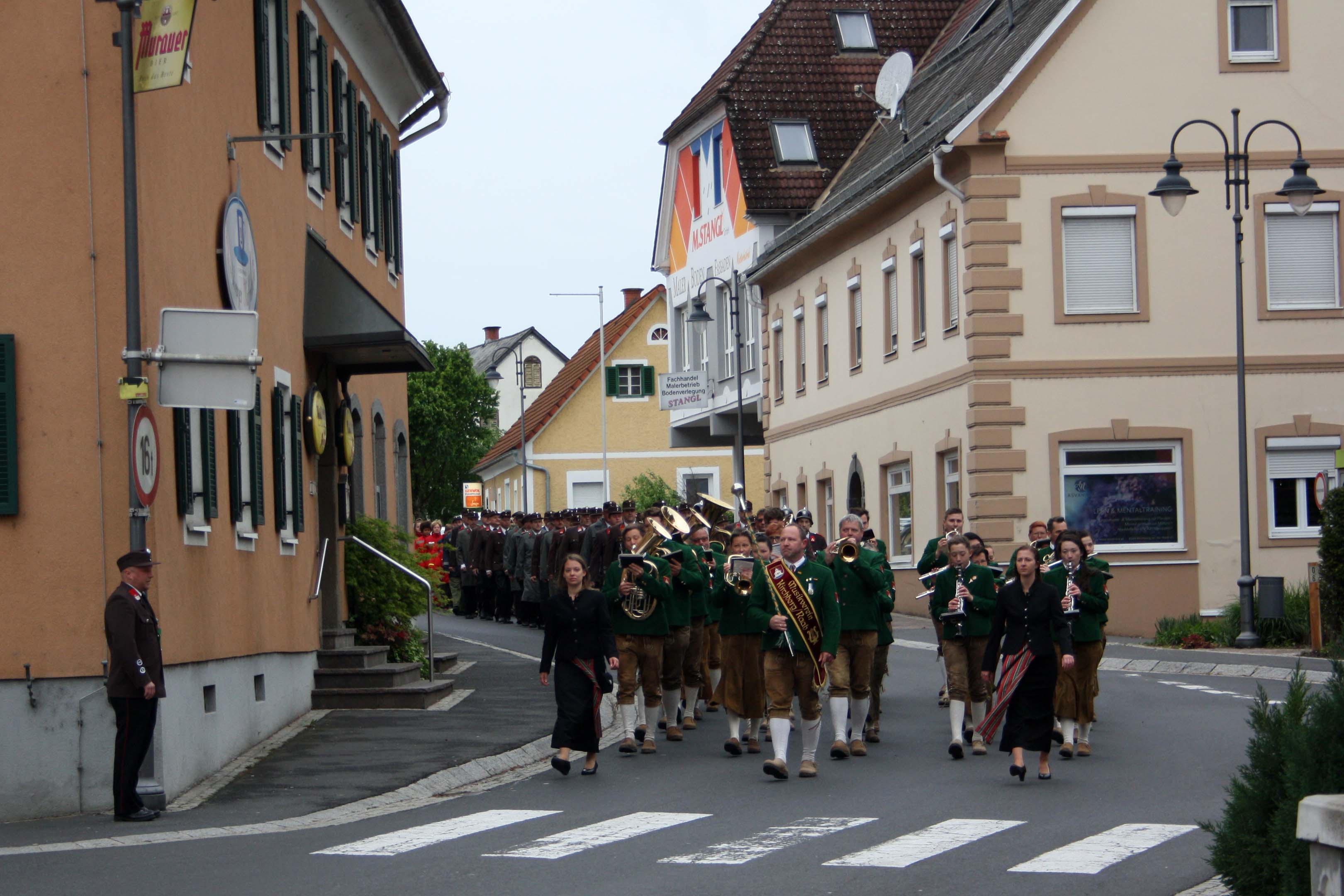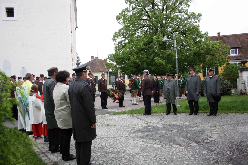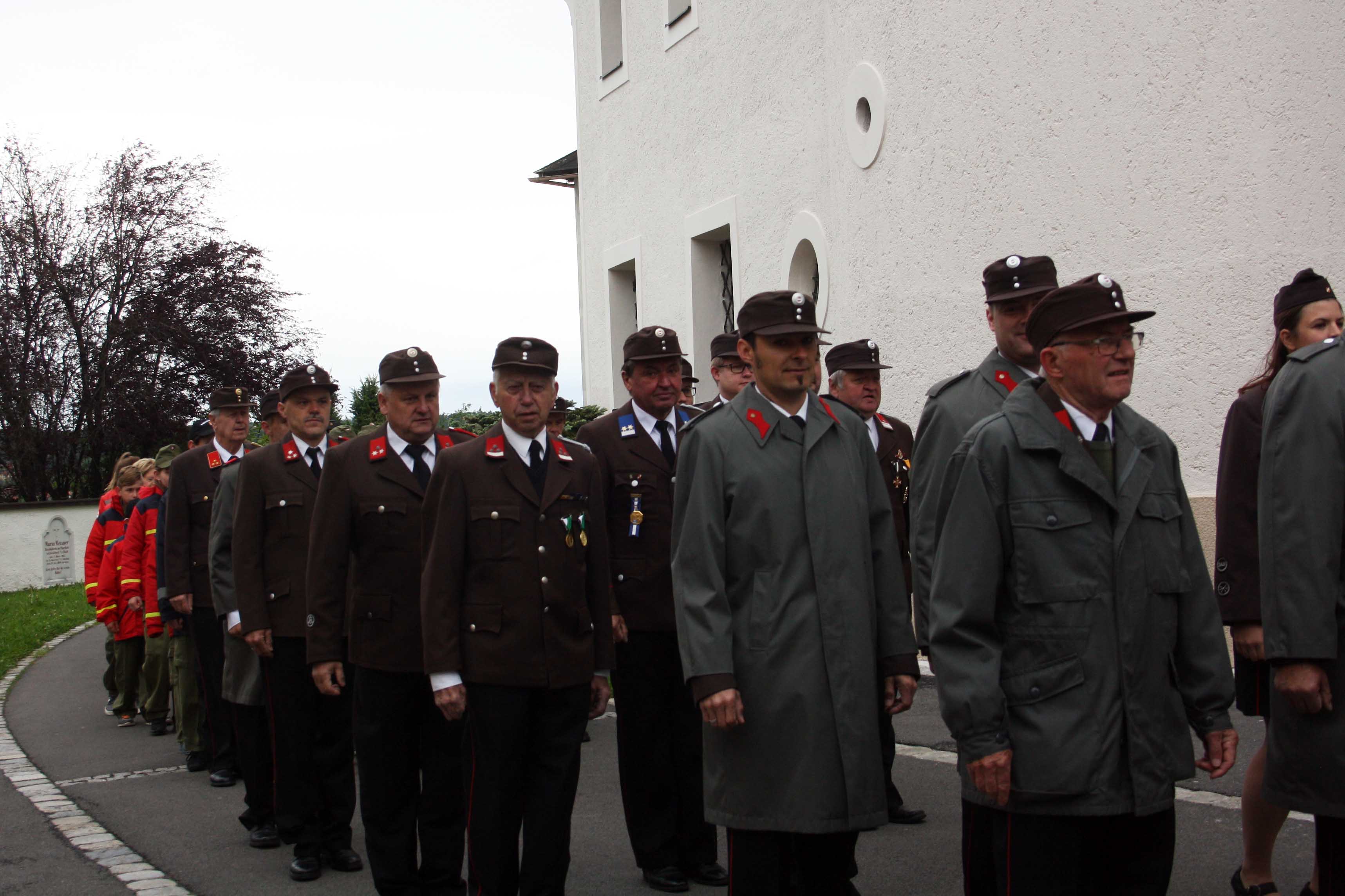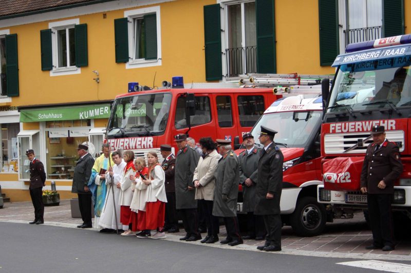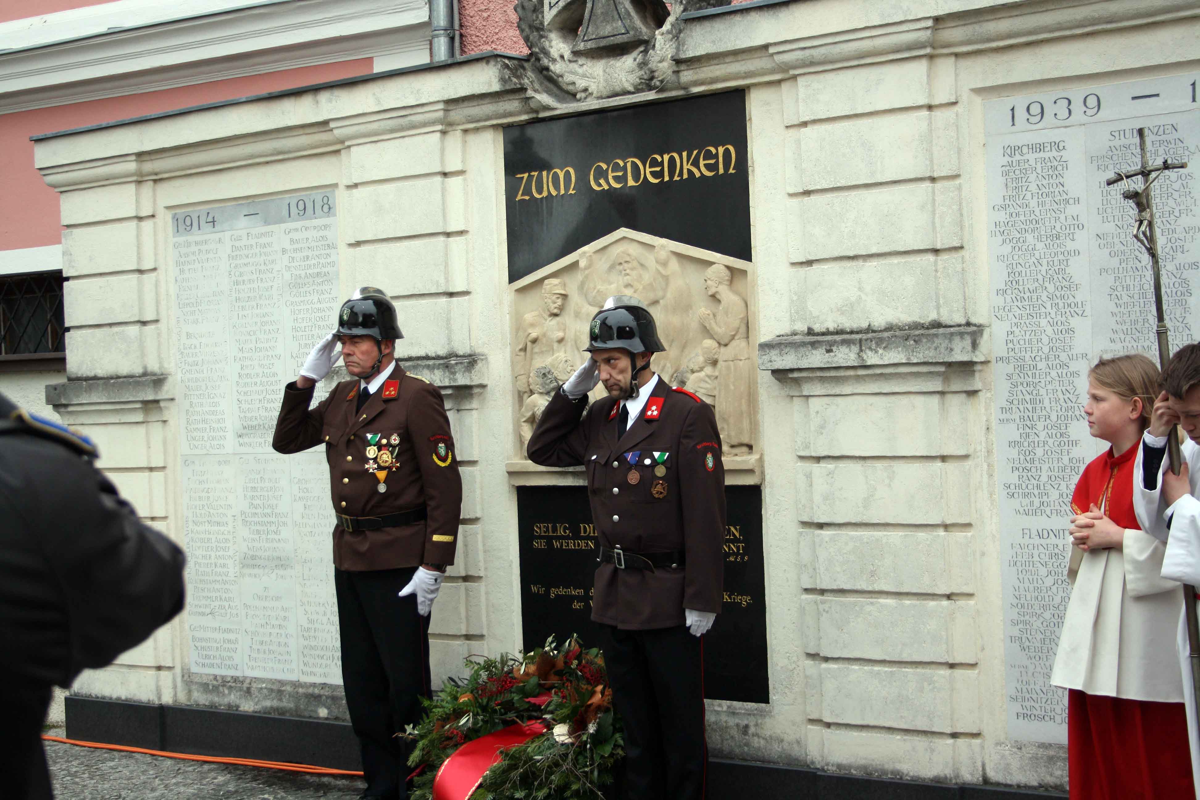 Bei kühlem und windigen Wetter traten die Mitglieder des Musikvereins Kirchberg an der Raab, die Feuerwehren der Pfarre Kirchberg und die Mitglieder des Roten Kreuzes an und marschierten zum Hauptplatz bei den Ehrengästen vorbei bis weiter zur Pfarrkirche. Nach der Kranzniederlegung beim Kriegerdenkmal wurde in die Kirche einmaschiert, wo der feierliche Gottesdienst statt fand.