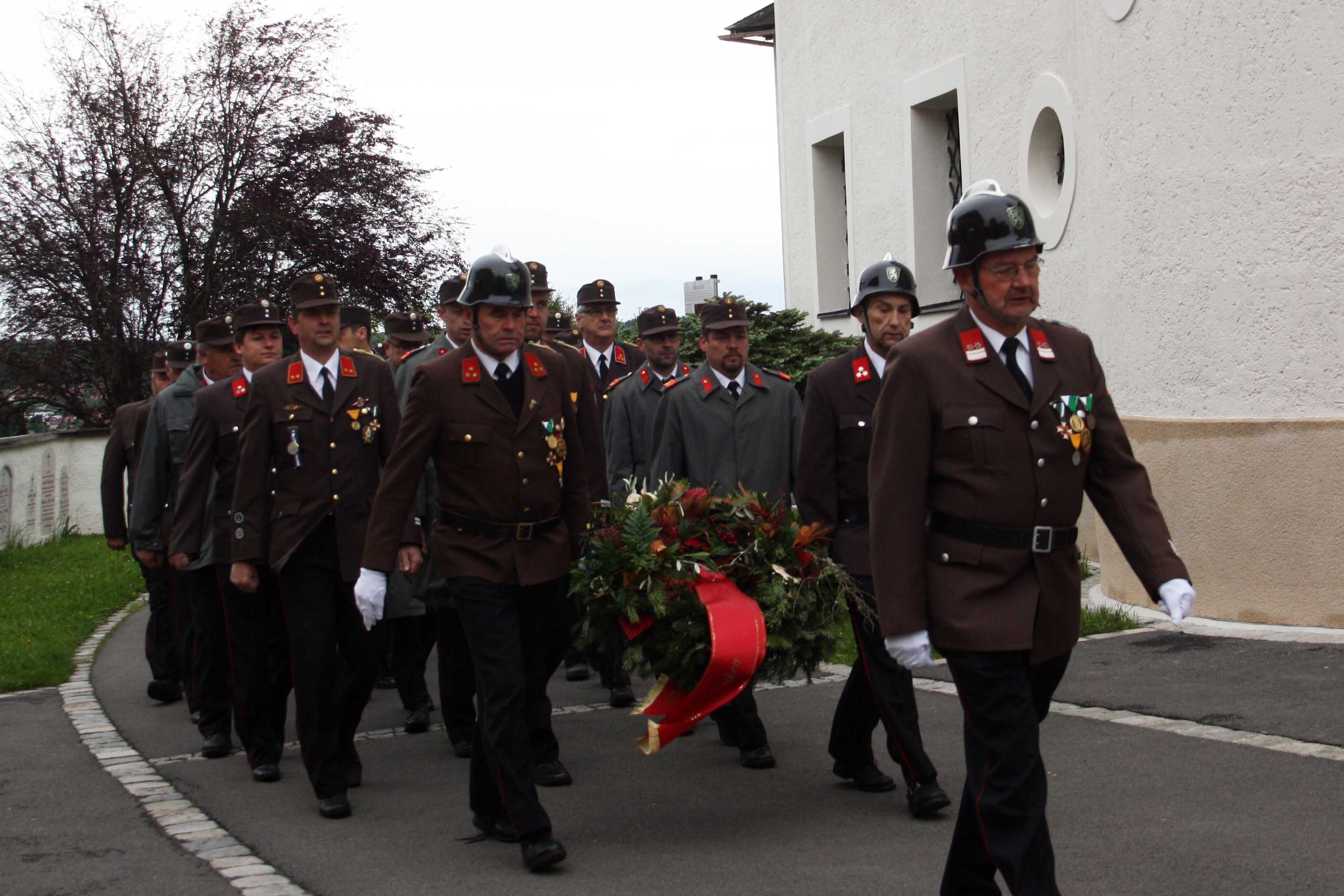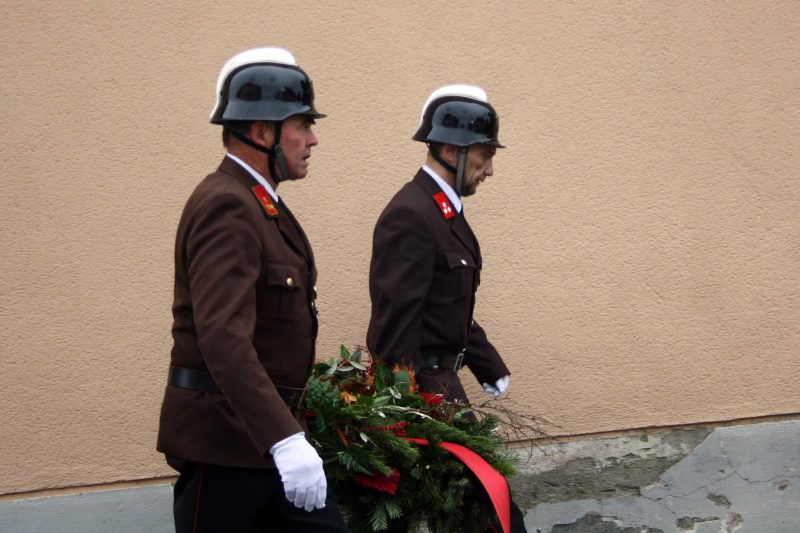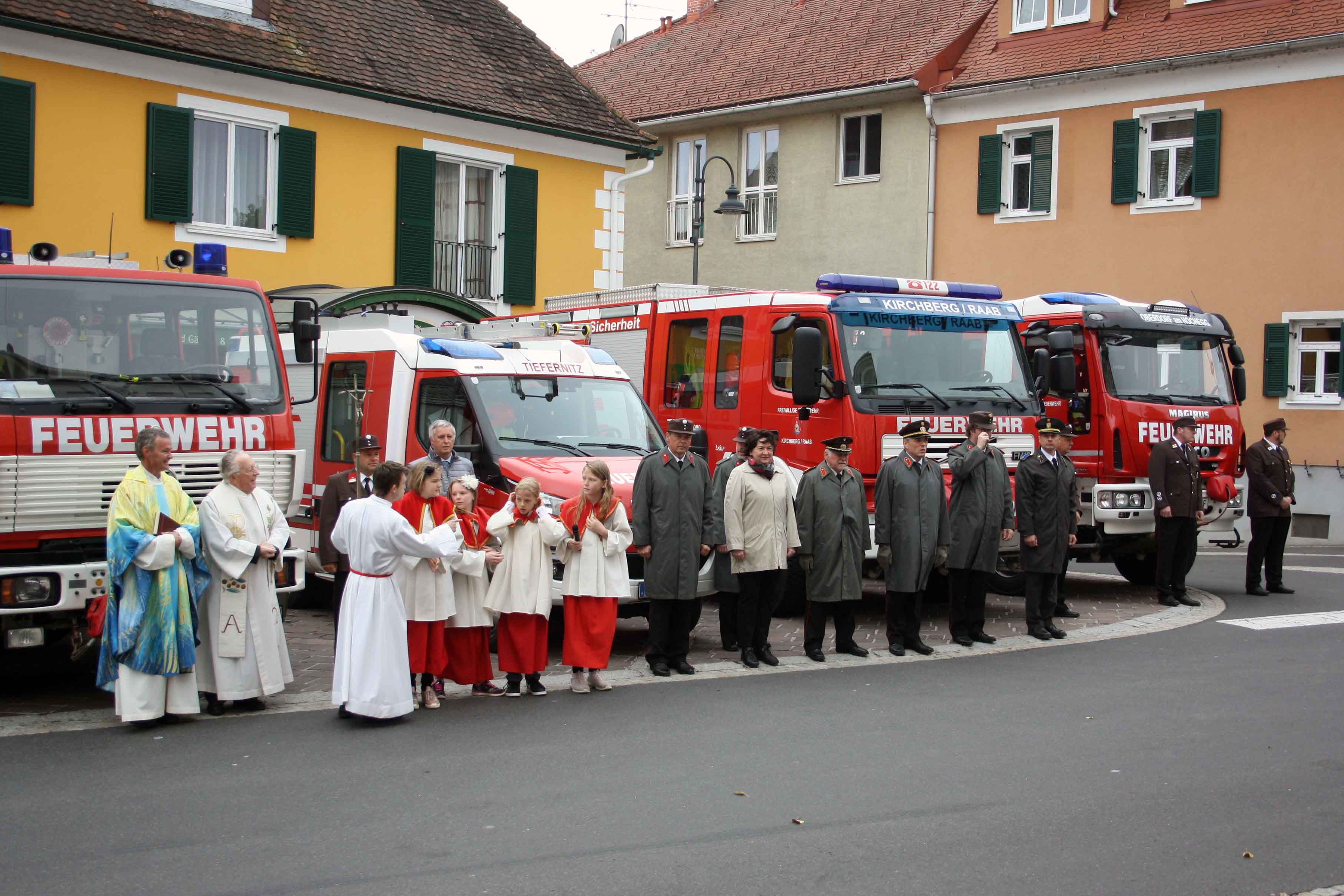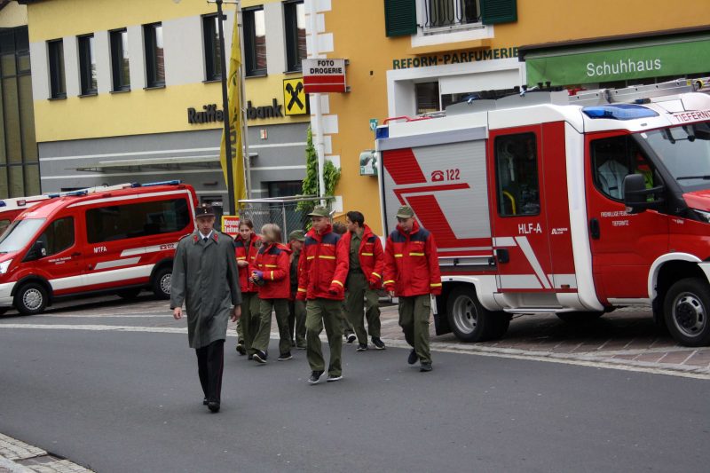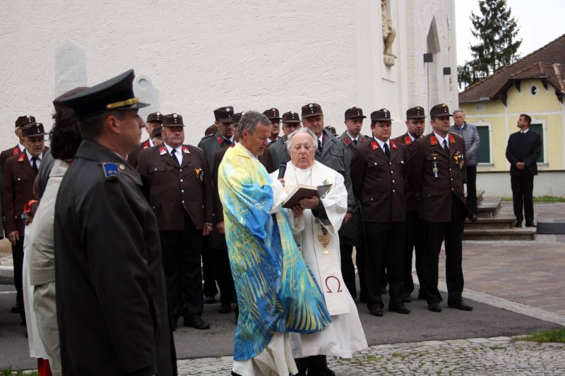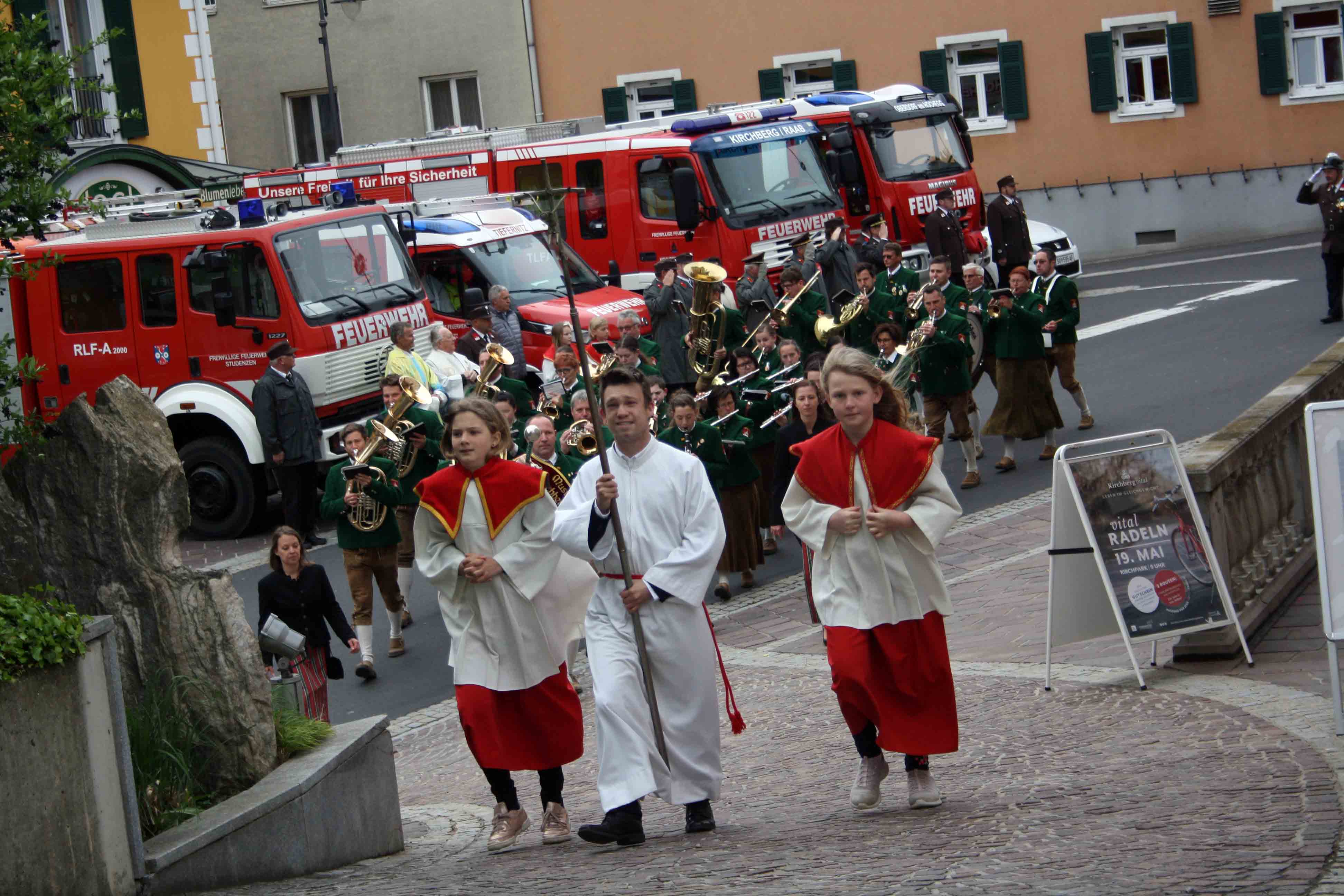 Bei kühlem und windigen Wetter traten die Mitglieder des Musikvereins Kirchberg an der Raab, die Feuerwehren der Pfarre Kirchberg und die Mitglieder des Roten Kreuzes an und marschierten zum Hauptplatz bei den Ehrengästen vorbei bis weiter zur Pfarrkirche. Nach der Kranzniederlegung beim Kriegerdenkmal wurde in die Kirche einmaschiert, wo der feierliche Gottesdienst statt fand.