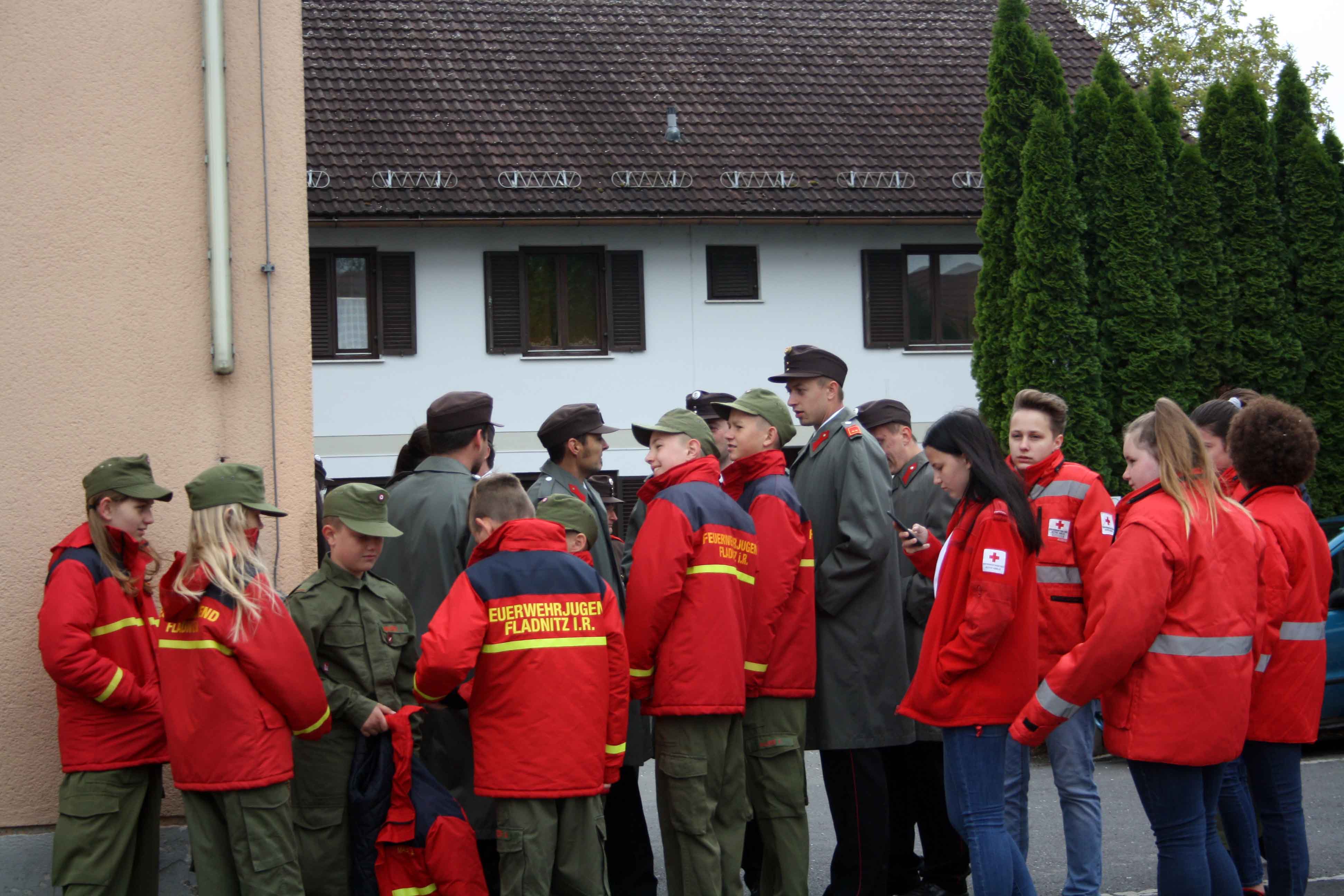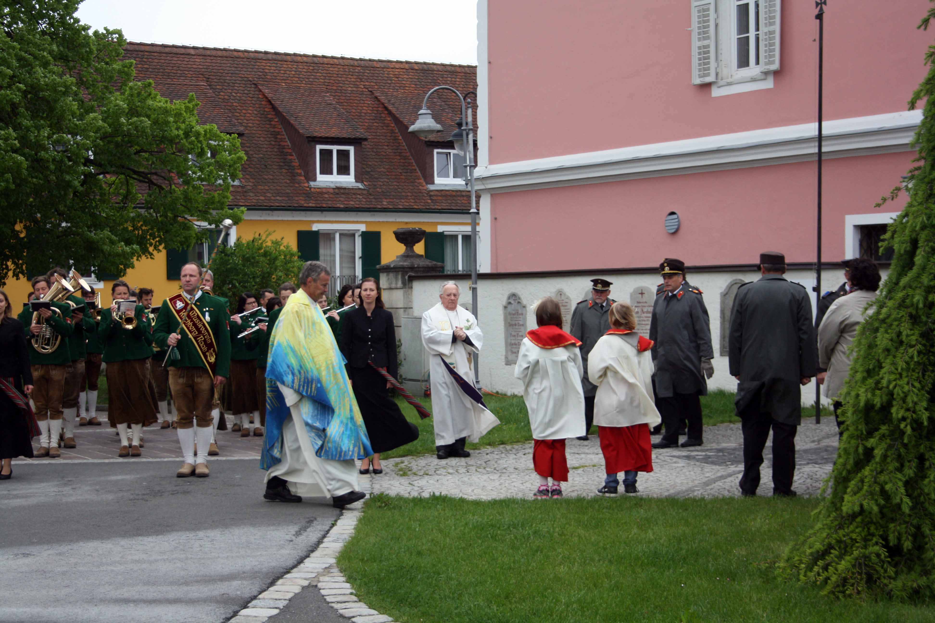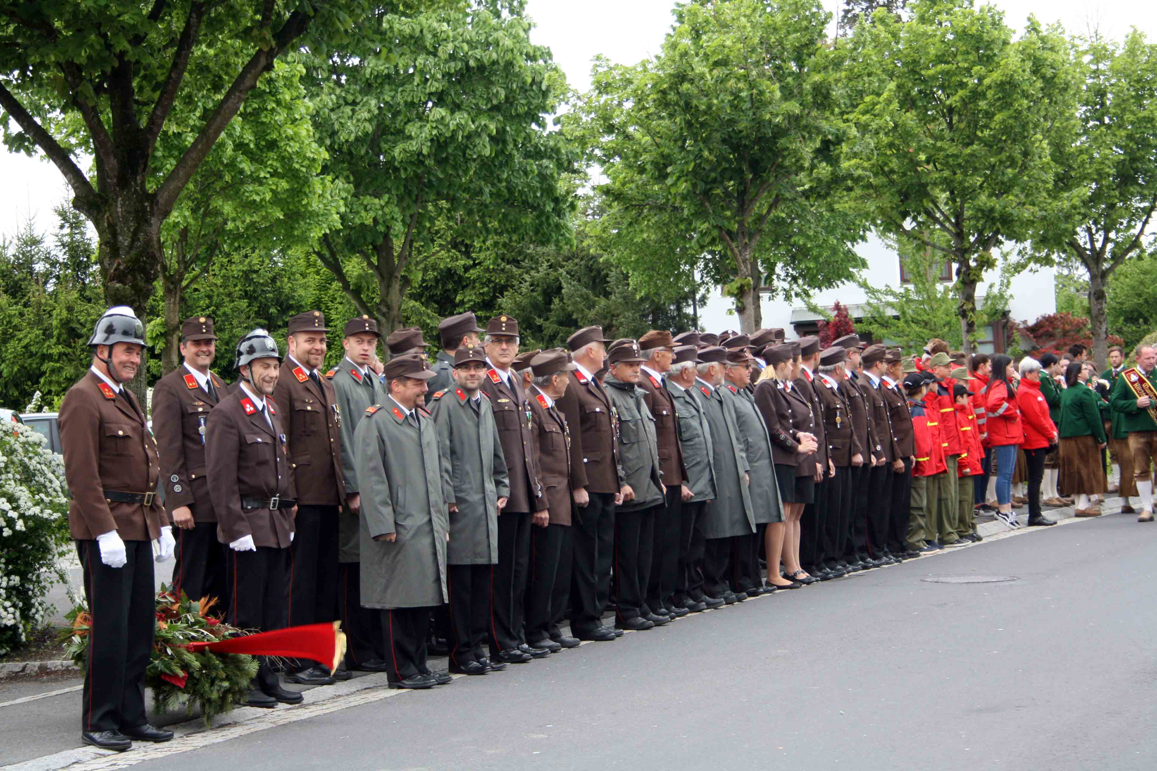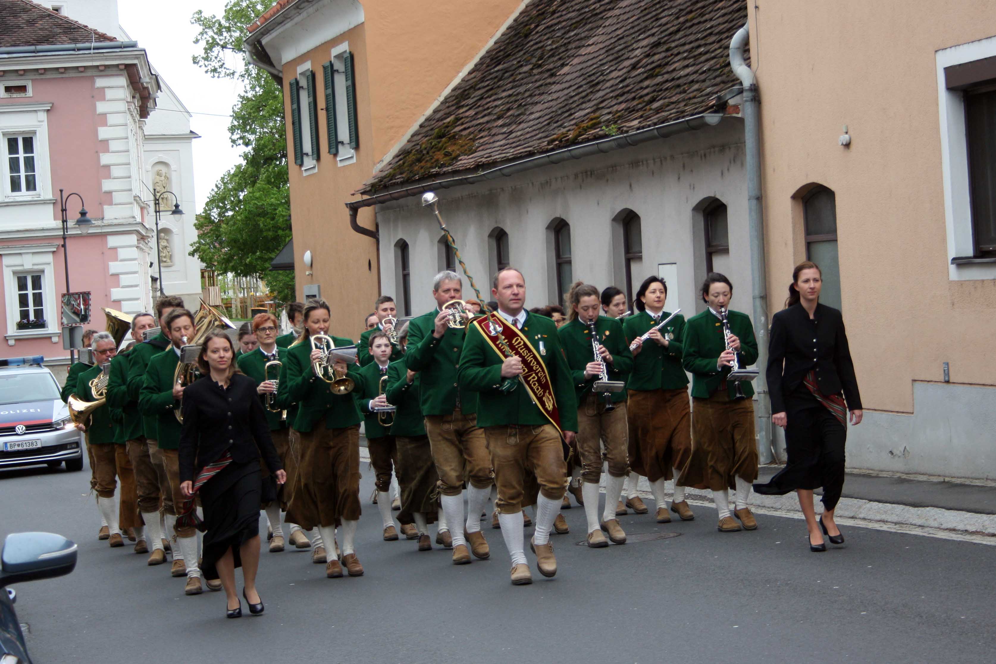 Bei kühlem und windigen Wetter traten die Mitglieder des Musikvereins Kirchberg an der Raab, die Feuerwehren der Pfarre Kirchberg und die Mitglieder des Roten Kreuzes an und marschierten zum Hauptplatz bei den Ehrengästen vorbei bis weiter zur Pfarrkirche. Nach der Kranzniederlegung beim Kriegerdenkmal wurde in die Kirche einmaschiert, wo der feierliche Gottesdienst statt fand.