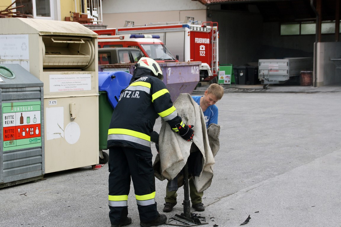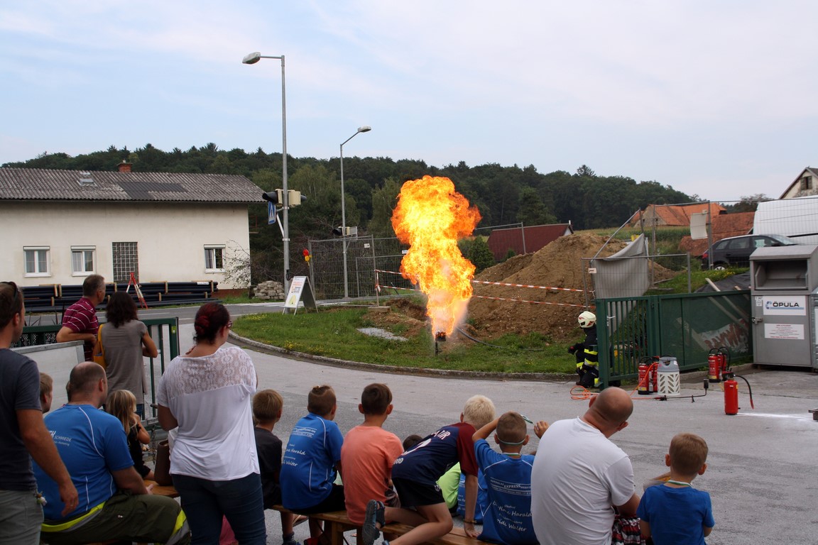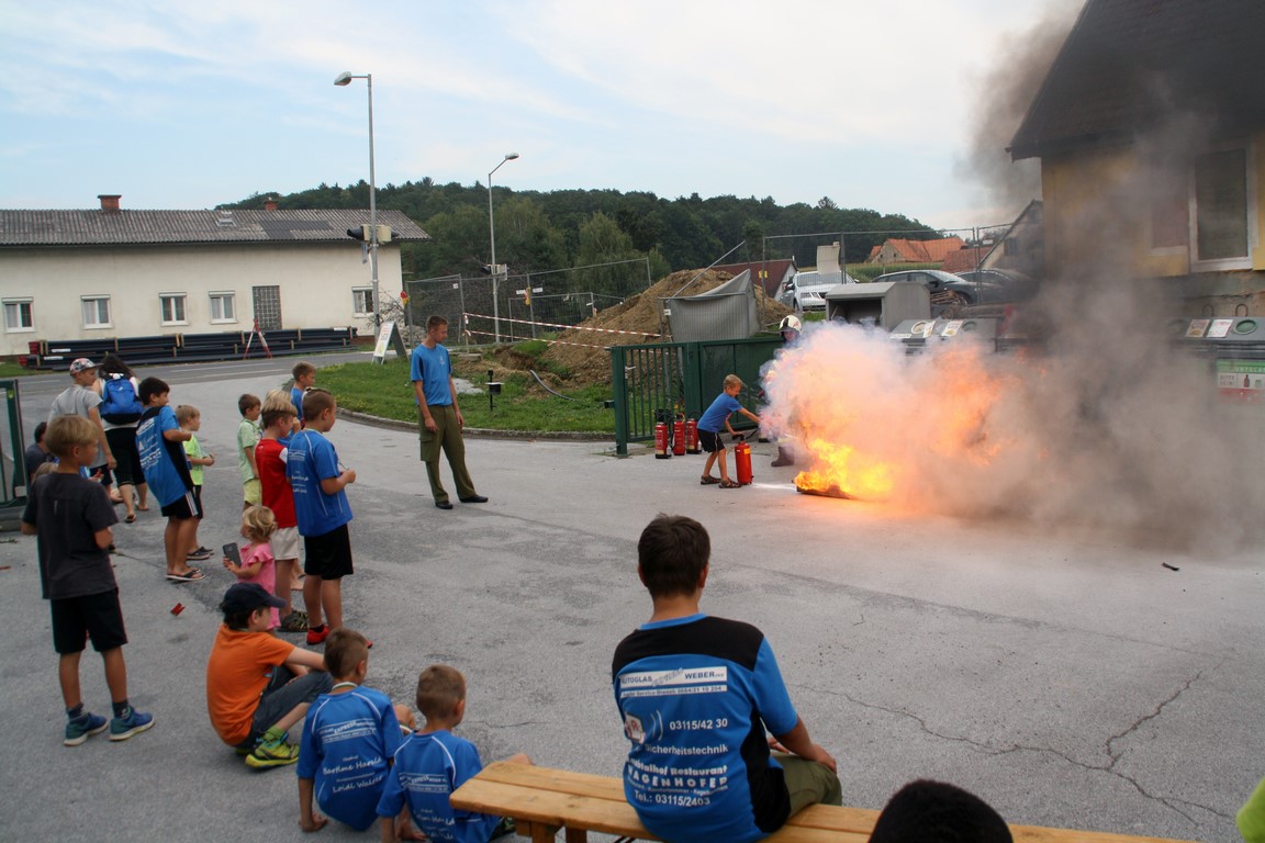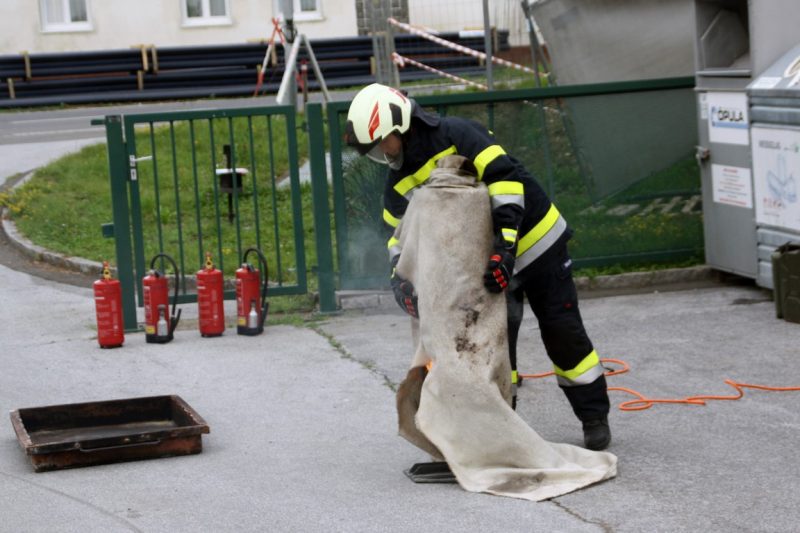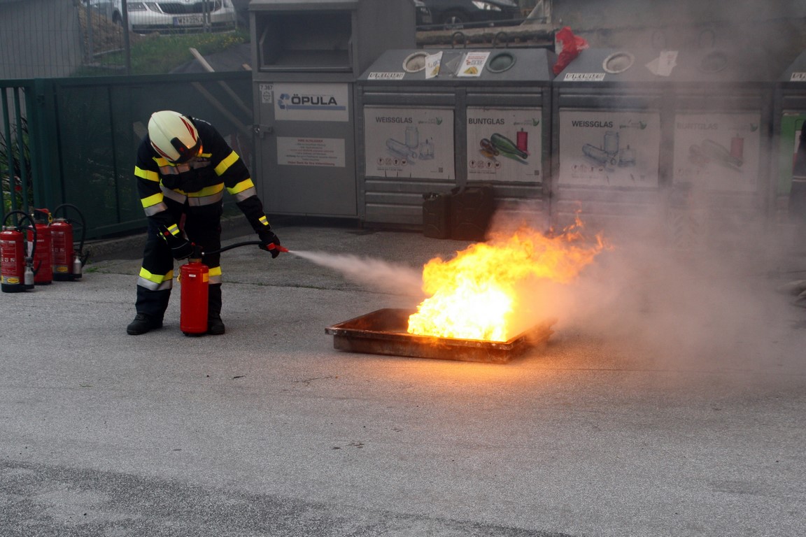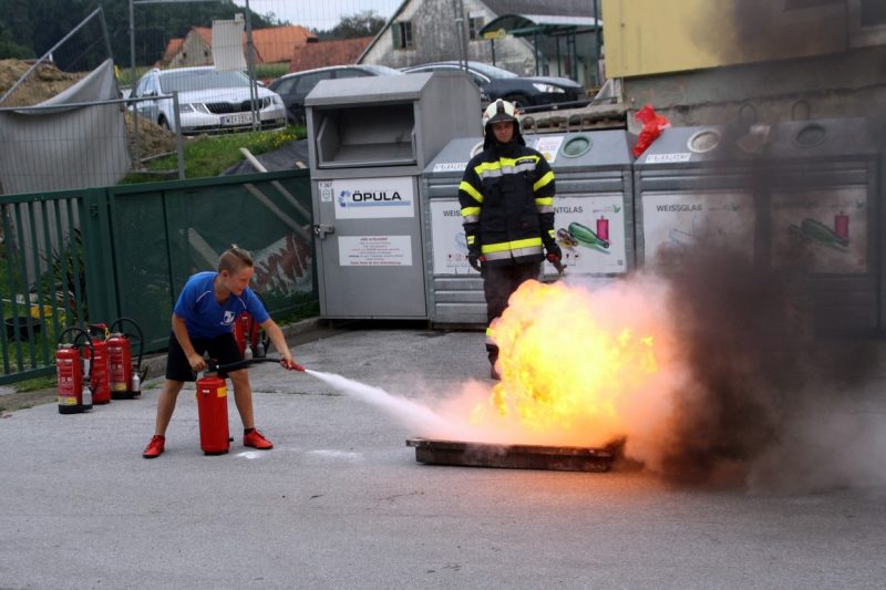 Im Anschluss informierten OBI Christian und LM Stefan Maurer über das richtige Verhalten bei Entstehungsbränden. Die Teilnehmer konnten auch selbst praxisnah mittels Löschdecke und Feuerlöscher Kleinbrände löschen.