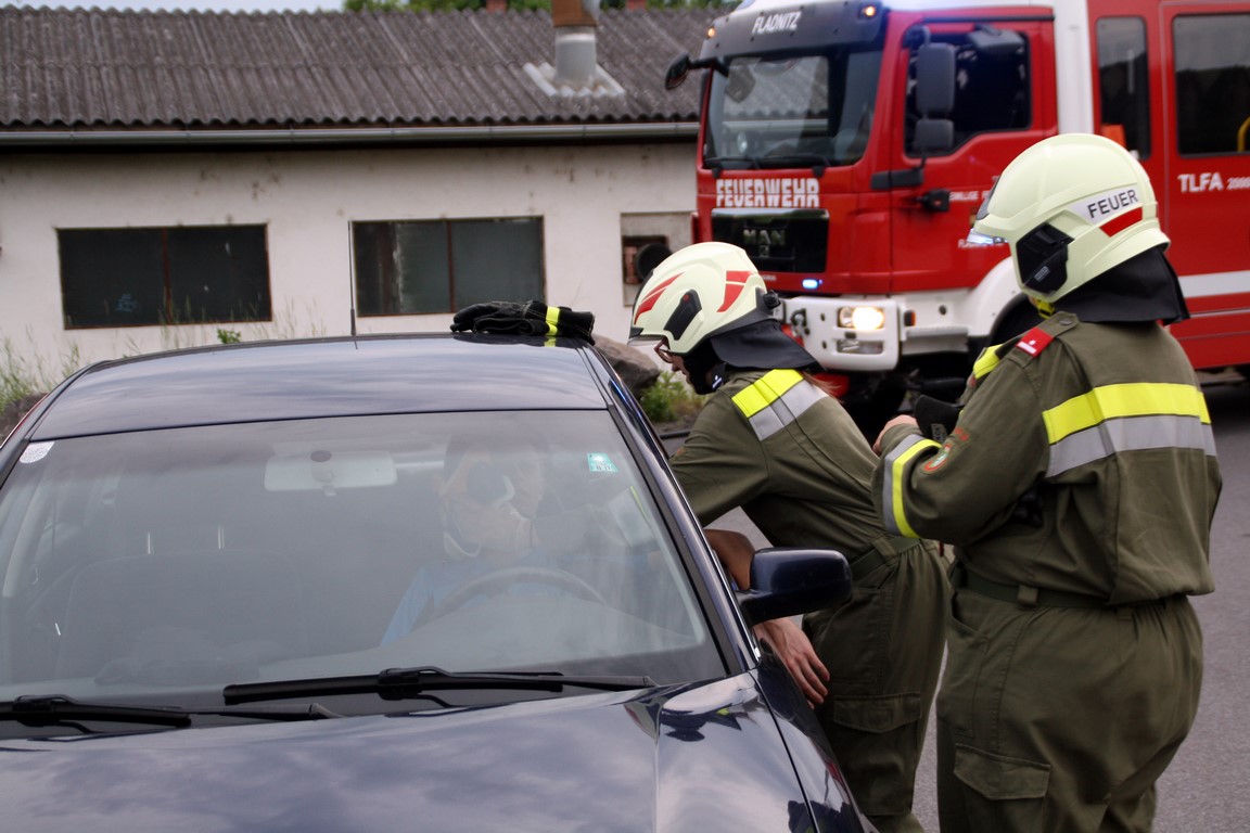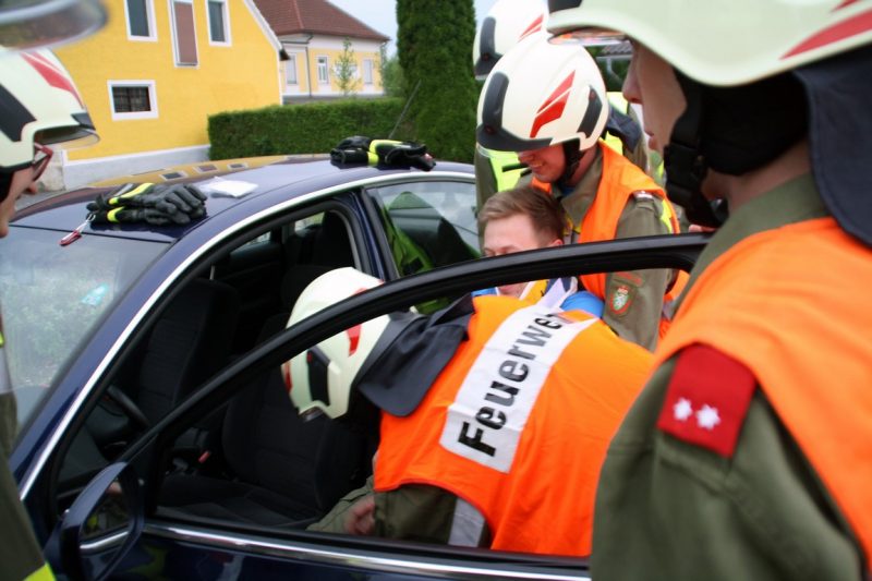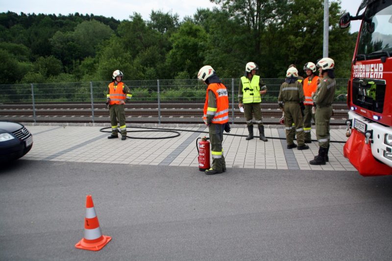 Nach einer kurzen Vorbesprechung wurden die Einsatzfahrzeuge hinter dem verunfallten PKW abgestellt und die Einsatzkräfte sicherten den Arbeitsbereich mit Verkehrsleitkegel, Warnblinkleuchten und Warndreiecken ab. Des Weiteren wurde im Anschluss die Betreuung und Rettung einer verletzten Person aus einem Fahrzeug geübt.