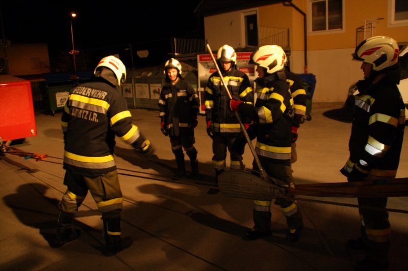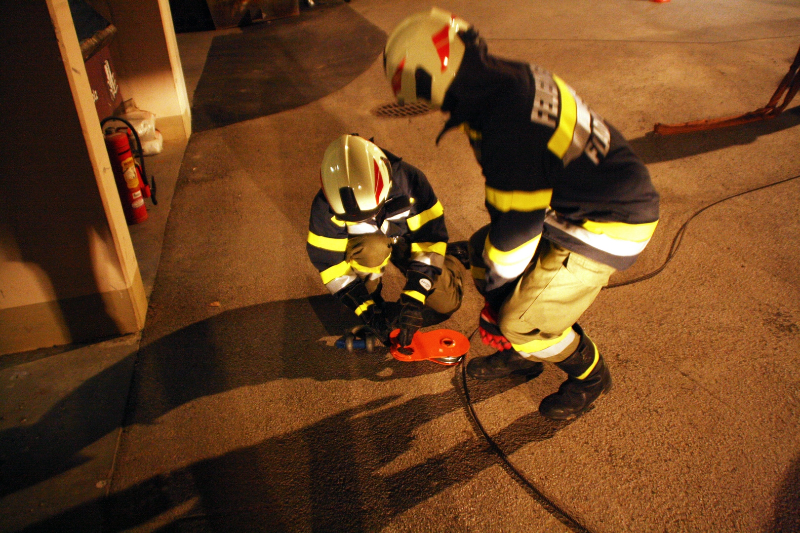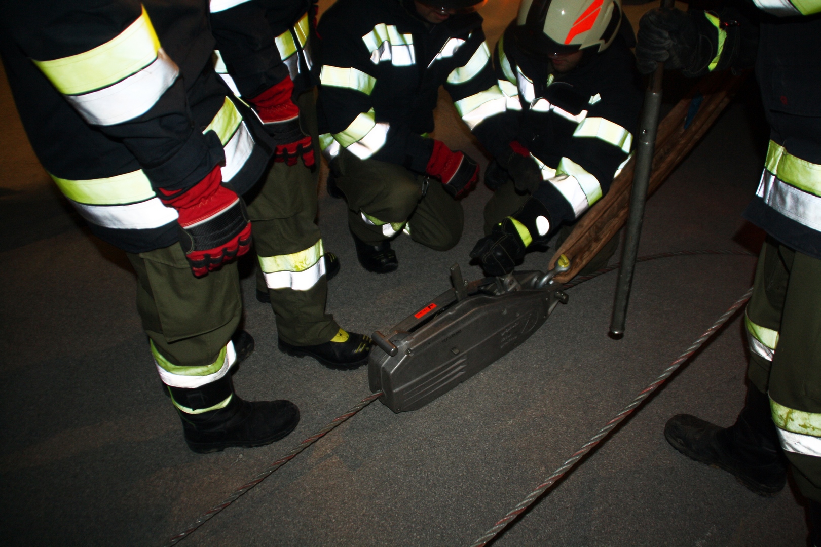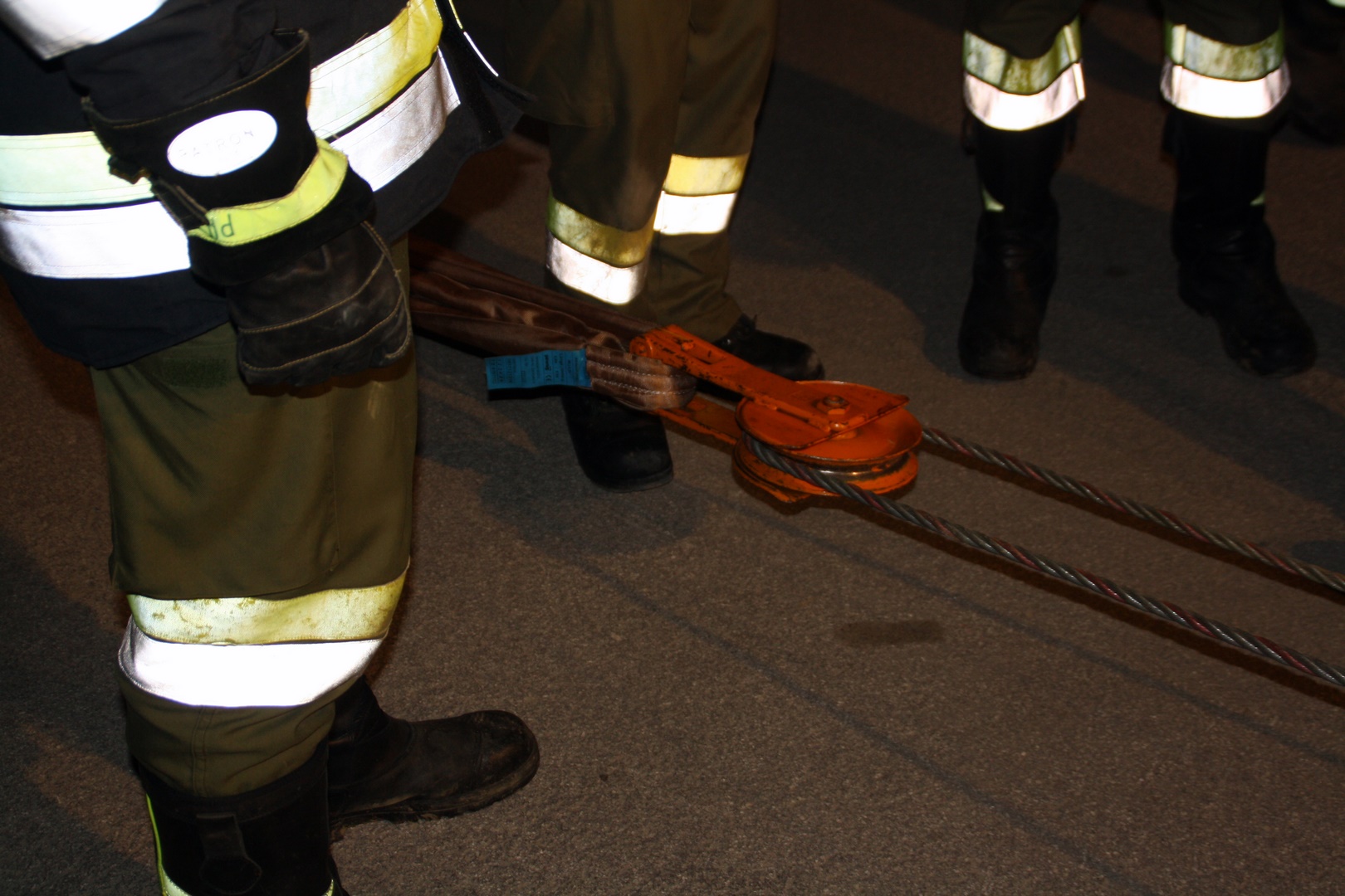 Die Übung begann mit einem Theorievortrag über die richtige Handhabung dieser Bergemitteln. Danach wurden die für den Einsatz dieser Geräte notwendigen Anschlagmitteln behandelt. Dabei wurde speziell auf die Möglichkeiten, die sich in der Verwendung von Umlenkrollen als ,,lose Rolle“ und ,,feste Rolle“ ergeben, eingegangen. Ein großes Augenmerk wurde auch auf die Kräfte, die im Seilwindeneinsatz auf die Anschlagpunkte und Anschlagmittel wirken, gelegt.