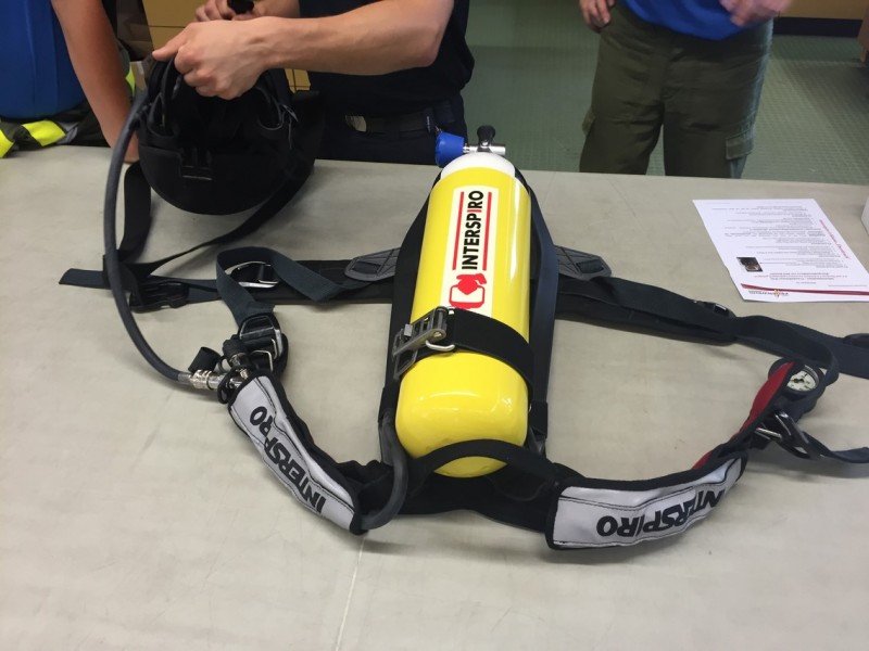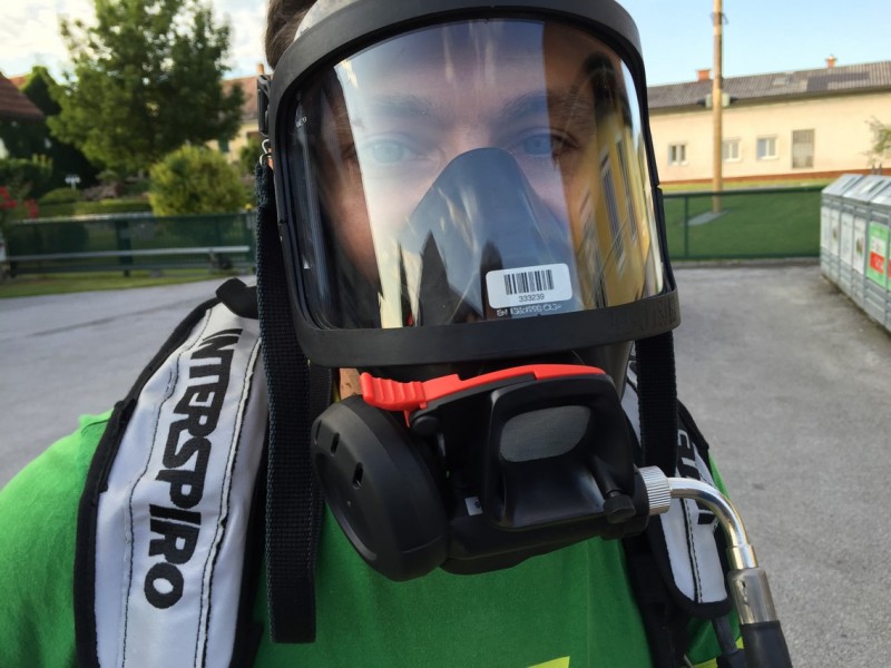 Zu Beginn des Jahres waren verschiedene Gerätehersteller bei uns zu Gast, um ihre Geräte zu präsentieren. Die Entscheidung fiel auf ein „Ein-Flaschen-System“ der Firma Interspiro, das mit 300 bar Flaschendruck arbeitet. Ein Merkmal der Ausrüstung ist ein sogenanntes Überdrucksystem, das verhindert, dass Rauchgase in die Atemmaske eindringen können. Zusätzlich sind die Atemmasken mit einem drahtlosen Maskenfunksystem ausgestattet. Durch dieses System ist es möglich, sich im Trupp zu verständigen, da in jeder Maske ein eigenes Funkgerät eingebaut ist. Das ist insofern hilfreich, da jedes Mitglied des Atemschutztrupps die Funkgespräche mitverfolgen und im Notfall selbst einen Funkspruch abgeben kann.